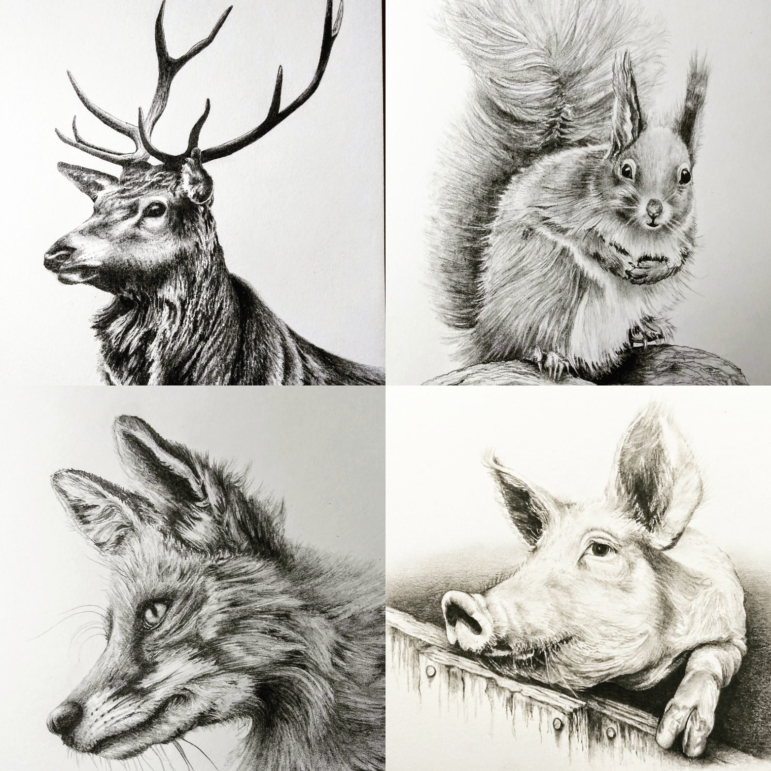 Hot off the printing press, my new wildlife series of cards have arrived. I haven't added them to my shop yet but they are available to buy now. I have 4 square cards (5x5") featuring a hare, stag, pig and highland cow, and 4 rectangular (7x5") cards featuring a blue tit, fox, red squirrel and badger.